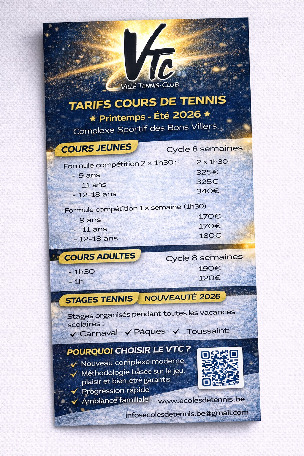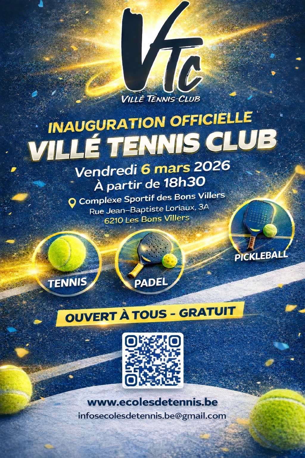 Villé Tennis Club Villé Tennis Club – Complexe Sportif des Bons Villers – Rue Jean-Baptiste Loriaux 3A – 6210 Les Bons Villers Inauguration officielle Villé Tennis Club Cycle printemps-été 2026 Inscriptions aux stages
